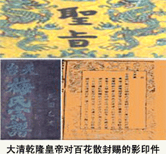 中國抗癌協會常務理事、河南省抗癌協會會長楊文獻教授和《百花散》傳人梅先生合影中國抗癌協會常務理事、河南省抗癌協會會長楊文獻教授和《百花散》傳人梅先生合影 據梅氏族譜記載,明末清初年間天臺縣深山有梅氏長者為當地草藥郎中,在深山采藥時,偶然進入人跡罕至的深澗,澗中飛瀑從天而降,懸崖峭壁環(huán)繞,古樹參天,奇花異草,蝶舞蜂飛,巖壁長滿靈蘭(鐵皮石斛仙人草)。深澗山洞中,有一石棺,棺中著明代服飾的白須老者栩栩如生,衣著完好;石桌有明朝正德年間治病強身《百花散》手抄醫書及白絹一幅,上有消化道腸胃、鼓漲病(肝腹水)、風濕關節(jié)等疾病配制方法。先人獲此神書神方,后依方所示,采澗中峭壁上之靈蘭、三七、猴頭菇和麝香等奇花異珍配制成不同系列的《百花散》,治療山民常見的消化道腸胃疾病、鼓漲病(肝腹水)、風濕關節(jié)疾病有奇效。山民食之,有病治病,無病健身。當地山民多長壽,童顏鶴發(fā)、身體強健的百歲老人隨處可見,均得益于神方《百花散》。當地民眾口碑相傳,美譽百花散為'神藥'、'藥王'。先人由此名聲大振,驚動大清朝庭,乾隆年間,皇帝多次下旨招先祖入朝并封賜。