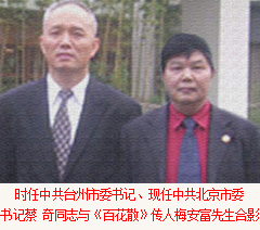 《百花散》傳人梅先生與中共臺州市委書記陳奕君同志合影紀念2018年7月《百花散》傳人梅先生與中共臺州市委書記陳奕君同志合影紀念2018年7月      天臺山古代中醫食療植物方梅氏《百花散》開發(fā)十年以來,已經使各類胃腸疾病患者及肝硬化腹水病人數萬人(包括胃病變、腸病變、食道病變、肝病變患者)恢復健康,得到廣大患者一致好評,并在康復患者中發(fā)展了數百名愛心使者擔任各地代理,為病痛患者服務引起社會強烈反響。古代傳世植物食療方《百花散》系列產品對胃病變、腸病變、食道病變、肝病變有神奇康復效果,已使眾多的重癥患者得到有效食療并康復。這一消息不脛而走,引起了河南省抗癌協會、河南省保健品協會、鄭州市腫瘤康復協會相關專家教授的高度重視,被禪醫武著稱的少林寺藥局局長釋延琳大法師和中國道教協會副會長、江西龍虎山天師府張金濤天師稱為中華民族之瑰寶,并得到社會各界人士和媒體關注。